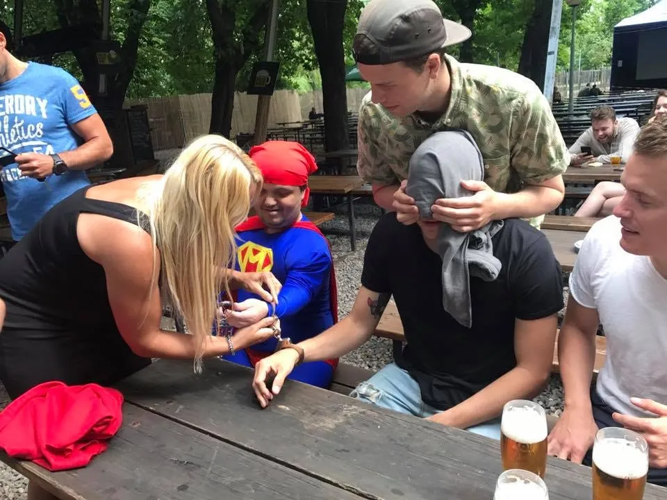 Let your best mate's embarrassment party begin! Get him handcuffed to a dwarf! One hour of a hilarious drama watching your friend getting along with his new BFF! Ask this little guy to dance for you or just annoy and humiliate your stag. Our midget has a rich collection of camp outfits, from Superman to James Bond. Just let us know your party theme, and the midget will blend with your squad. Let him get involved, and unforgettable fun is guaranteed! The little guy will make sure the future groom get ALL the attention before settling down for a quiet family life.